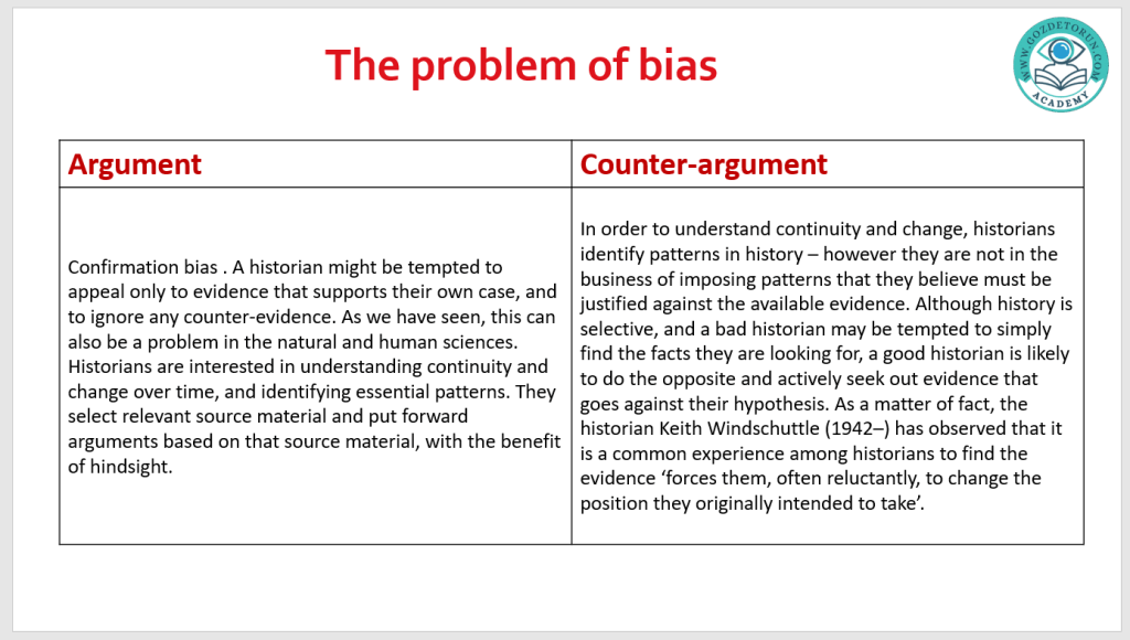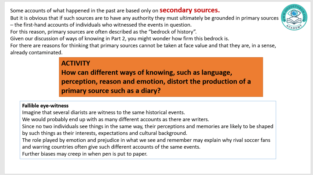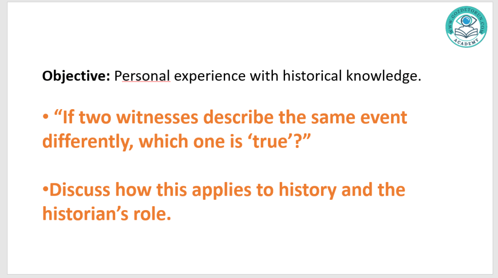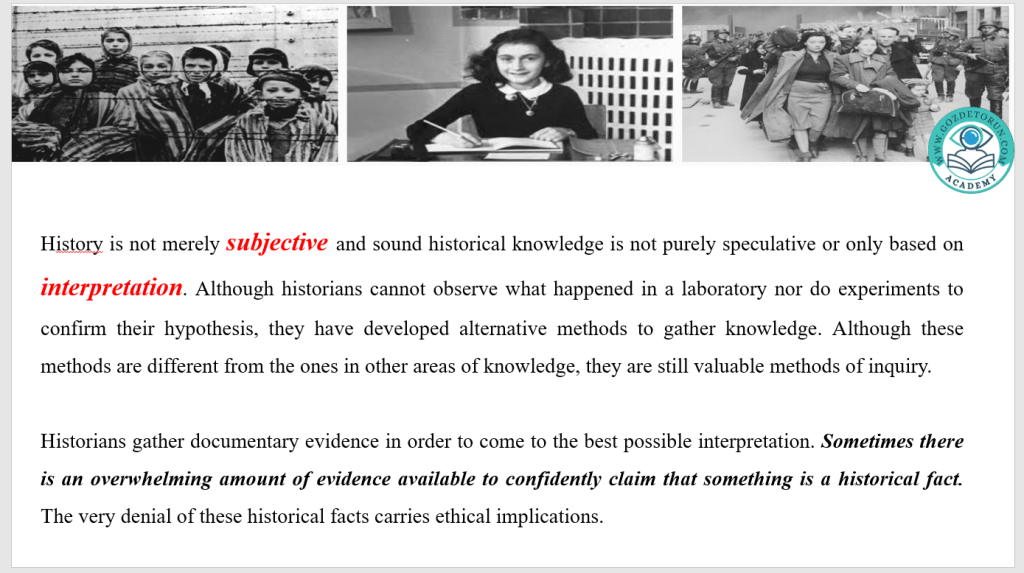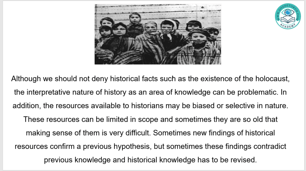 Current history lessons (hopefully) allow for an exploration of different perspectives and possible interpretative difference when faced with the same “facts”. It is important to understand that there are several possible issues with the interpretations of historical sources. The sources themselves may be biased and the interpretation of these sources can be subjective. In addition, you can select the sources to suit your agenda. However, the inclusion of a range of perspectives may lead you closer to genuine historical knowledge. The evaluation of the validity of historical knowledge claims may lead to the elimination of invalid and contradictory knowledge. Sometimes parts of the historical knowledge map needs to be re-written. A relativistic approach to history cannot generally be maintained (you cannot both claim the holocaust happened and that it did not happen). The inclusion of a wider range of sources may lead to more detailed knowledge maps.