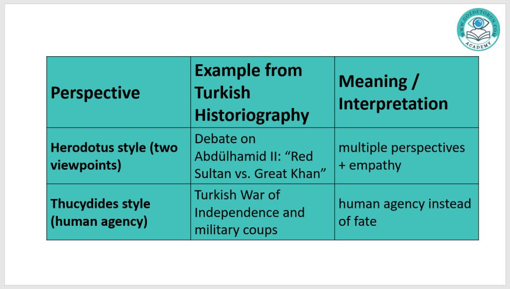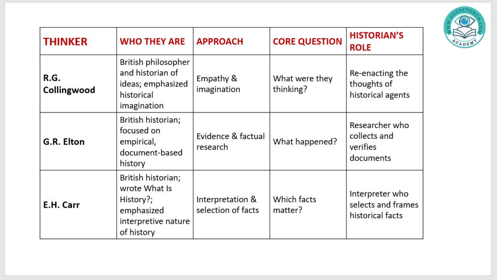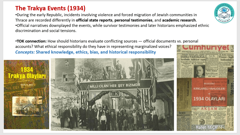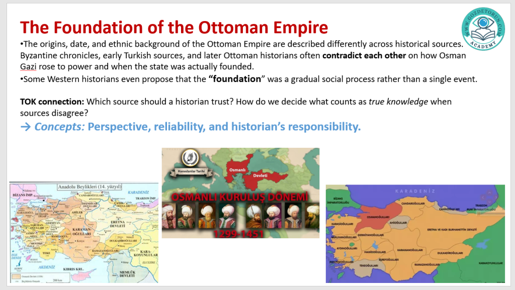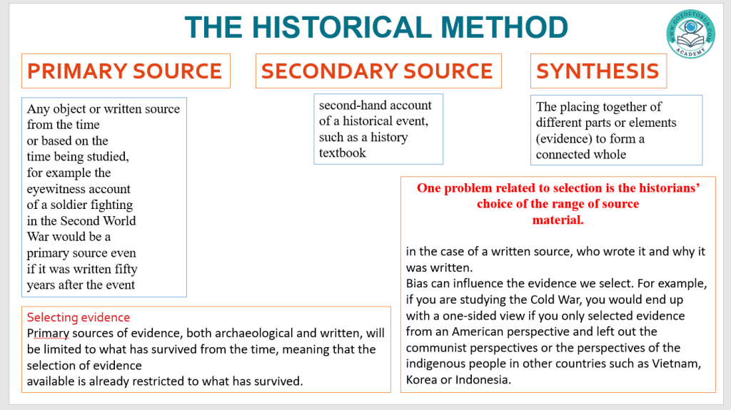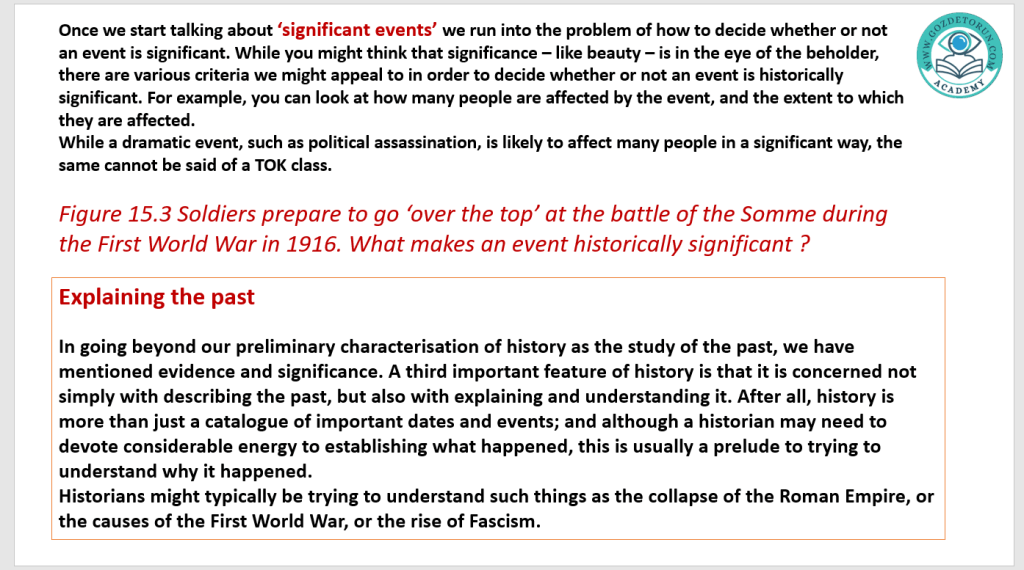 Current history lessons (hopefully) allow for an exploration of different perspectives and possible interpretative difference when faced with the same “facts”. It is important to understand that there are several possible issues with the interpretations of historical sources. The sources themselves may be biased and the interpretation of these sources can be subjective. In addition, you can select the sources to suit your agenda. However, the inclusion of a range of perspectives may lead you closer to genuine historical knowledge. The evaluation of the validity of historical knowledge claims may lead to the elimination of invalid and contradictory knowledge. Sometimes parts of the historical knowledge map needs to be re-written. A relativistic approach to history cannot generally be maintained (you cannot both claim the holocaust happened and that it did not happen). The inclusion of a wider range of sources may lead to more detailed knowledge maps.