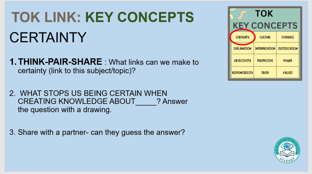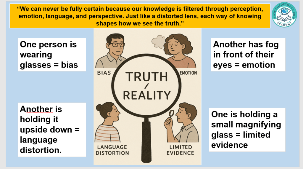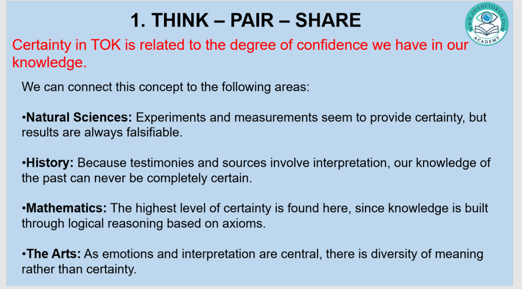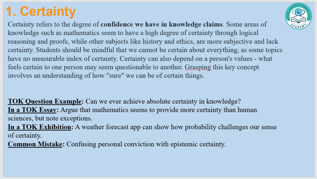 | Certainty | Level of confidence in a knowledge claim | Math proof vs. weather forecast |