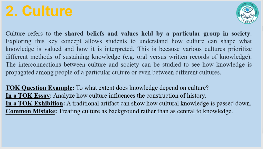 | Culture | Shared beliefs shaping knowledge | A cultural ritual or tradition |