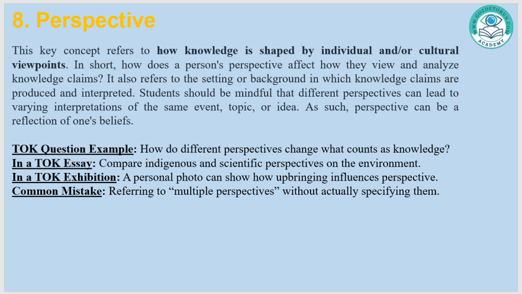 | Perspective | A particular viewpoint shaped by context | Indigenous vs. scientific views |