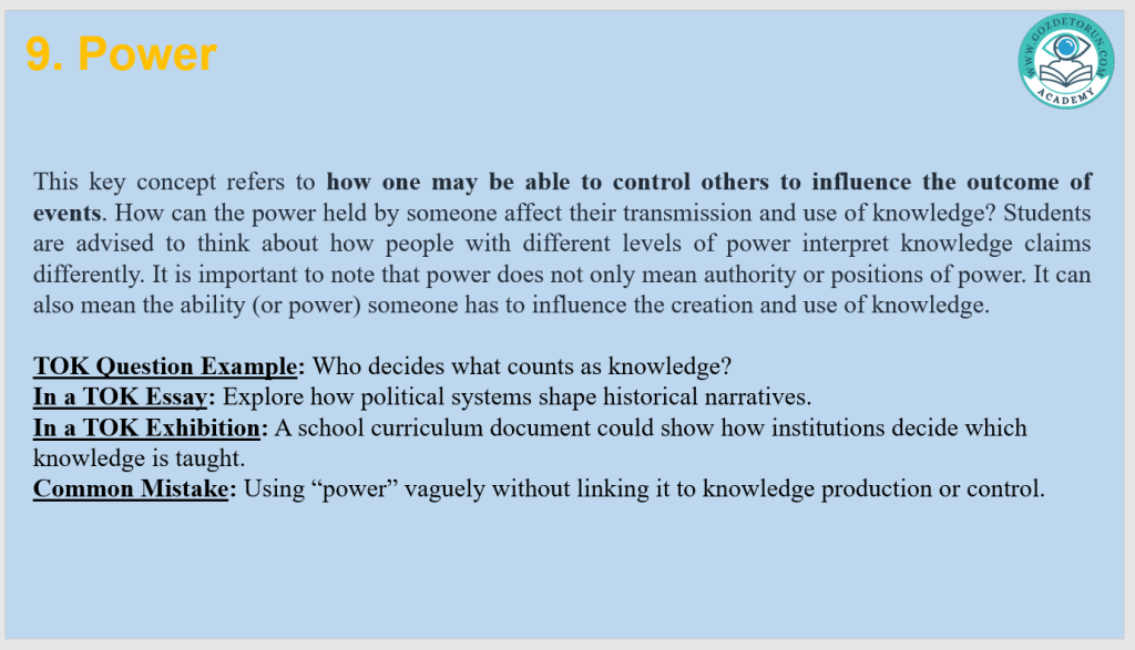 | Power | Influence over what knowledge is accepted | A government-issued textbook |