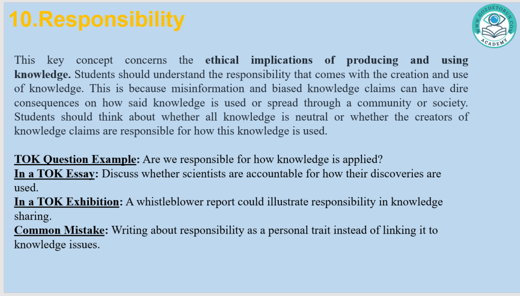 | Responsibility | Ethical obligation tied to knowledge | A whistleblower’s report |
