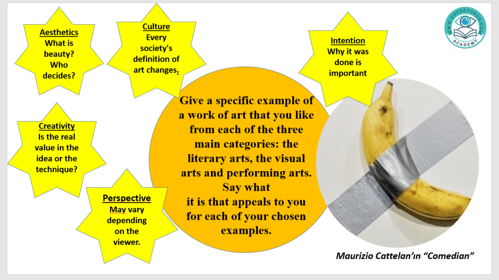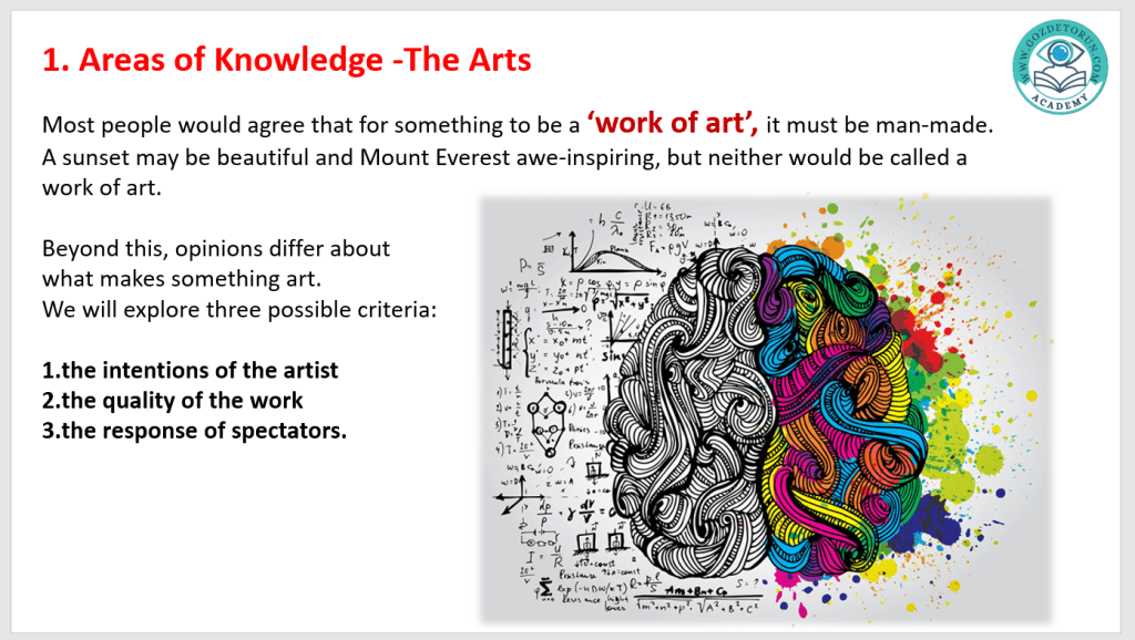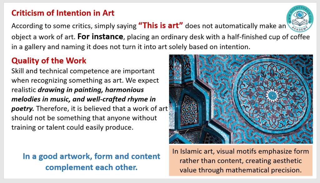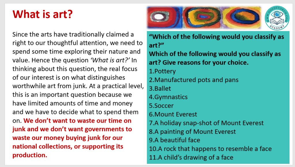 | Can I discuss the purpose of the arts, including the significance of the intentions of the artist? | ||