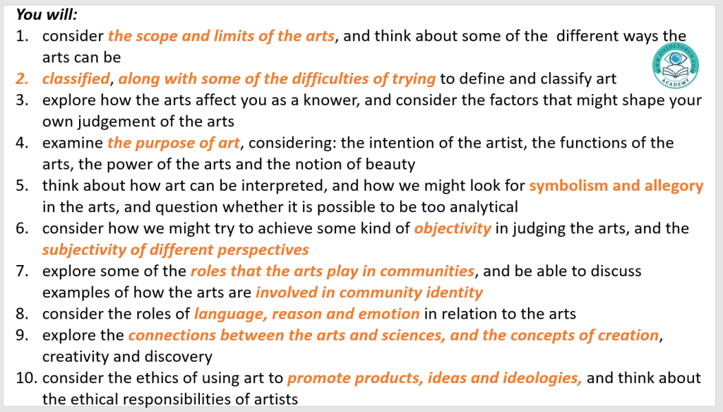 | Can I discuss the scope and limits of the arts, including some of the different ways the arts can be classified, along with some of the difficulties of trying to define and classify art? | ||